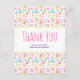 Thank you postcard with a whimsical love themed pattern perfect for a Valentine's day themed event. Heart on a stick, love letters, muffins, tulips and cherries bring joy and happiness to this cute little pattern.