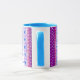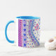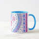 A pretty and romantic ringer mug with a powder blue rim and handle and a design of pink and blue roses and hearts, from an original gouache painting by Judy Adamson. This design is also available on greeting cards and various gifts.