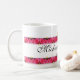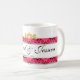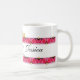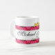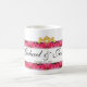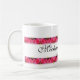 With original artwork by ZoeSPEAK designed for lovers, this Mug is bordered top and bottom by a band of pink roses and golden hearts. In the centre of the upper band of roses there are two bows of golden ribbon which form a heart where they join in the centre. Two gold hearts join the bows in the centre, completing the design. The names of the couple are in black script on the white background between the roses, with the special date below. All text is set to be personalise.