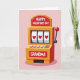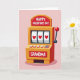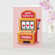 This greeting card features a stylized slot machine centered on a soft, muted pink background, with a golden-yellow body that looks warmly lit and inviting. Across the top marquee, the text “HAPPY VALENTINE’S DAY” sits in bold white letters on a glossy red panel, with tiny highlight spots that make it look shiny ❤️. In the middle, three reels line up neatly to show red hearts on white squares, like a lucky match that hints at shared affection 🥰. A classic side lever rises on the right, capped with a cherry-red ball that feels ready to be pulled. Near the bottom, “GRANDMA” appears in white lettering on another red panel, turning the scene into a sweet family-focused Valentine. The simple cartoon style and saturated reds and yellows keep the focus on the hearts and the warm, cozy mood between giver and recipient. Small reflective gleams dot the red panels and the lever’s red knob, while the heart symbols sit evenly spaced across the three reels.