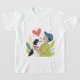 A cheerful and loving T-shirt design featuring a young boy in a green shirt and blue baseball cap hugging his black-and-white dog with a red collar. A large red heart floats above them, symbolising their strong bond. Set against a soft lavender background with playful leaves, dots, and sparkling stars, this heartwarming design is perfect for boys who love dogs and cute, affectionate artwork.