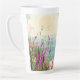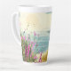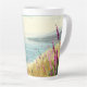 This artwork depicts a serene coastal landscape bathed in soft sunlight. Vibrant pink and purple wildflowers, likely heather, frame the foreground, swaying amidst golden grasses. The calm blue ocean stretches out under a pastel sky, with distant hills adding depth to the horizon. This tranquil scene evokes the beauty of nature, summer blooms, and seaside charm, perfect for evoking relaxation and wanderlust.