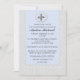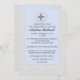 A refined and elegant, damask pattern has a scalloped overlay of dove blue. At the top centre, a double scalloped crest holds a silver cross. A beautiful invitation to invite your guests to any religious occasion.