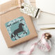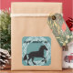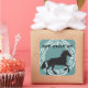 Cute black silohuette of a horse against a teal background and encircled in a vintage style circle. The words, "Yom Huledet Sameach" (Happy Birthday in Hebrew) match the black silohuette.