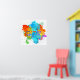 The Hebrew word "shalom" (meaning 'peace' but also 'hello') in an artsy form over a colourful paint splashes background.