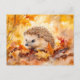 Hedgehog in autumn leaves watercolor painting postcard