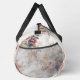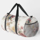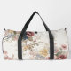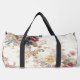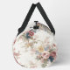 This image showcases a duffel bag adorned with a beautifully faded and intricate floral print, evoking the charm of heirloom chintz or a vintage garden tapestry. The design features a delicate array of blossoms in muted tones of dusty pink, soft yellow, faded blue, and subtle burgundy, intertwined with leafy branches, all set against a textured, antique white background. The overall aesthetic is one of timeless elegance and gentle nostalgia. Equipped with sturdy, dark-coloured straps and a secure zipper closure, this bag is a functional yet exquisitely designed accessory, perfect for travel, gym use, or adding a sophisticated, old-world touch to any ensemble.