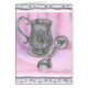 An heriloom cup sits next to a baby rattle in this work by Tara Friel. A figure of a teddy bear is carved into the end of the rattle, and intricate floral patterns are adorn the sides of the cup. A great piece, put this on your wall today!