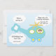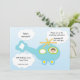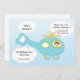A cute invitation for a birthday party or baby boy shower with blue helicopter with little boy in the window, white clouds on blue background.