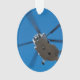 Photograph of a large helicopter taken from below looking up at the bright blue sky