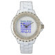 Wrist watch features the Greek flag and the word, HELLAS, below in blue. The flag shows blue and white stripes with a blue and white cross in the upper right area. Above it, add your name, in blue letters, for a personalised touch or create a customised gift. Fun for family reunions, travel groups, and sharing your love and pride in your heritage, ancestry and culture. Great for celebrating Oxi Day.
