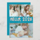 Whimsical and modern New Year's photo template card featuring a typography text that says "Hello, 2026" with 3 of your pictures. You can add another picture and a message on the back of the card. Aqua blue color.