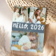 Whimsical and modern New Year's photo template card featuring a typography text that says "Hello, 2026" with 3 of your pictures. You can add another picture and a message on the back of the card. Slate blue color.