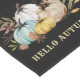 Hello autumn watercolor pumpkins, foliage, and family name. A modern style with colourful pumpkins and greenery on black. For autumn table decor. Personalise with your family name.