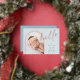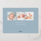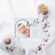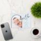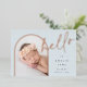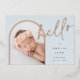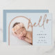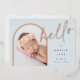An elegant photo birth announcement design with a unique layout, this chic card features a vertical photo in an arched shape on a soft dusty pale blue background, with "hello" in rose gold foil hand lettered script typography. Personalise with your new baby's name, birthdate, and birth stats, and add a personal message to the back, along with three additional square photos.