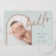 An elegant photo birth announcement design with a unique layout, this chic card features a vertical photo in an arched shape on a soft sage green background, with "hello" in rose gold foil hand lettered script typography. Personalise with your new baby's name, birthdate, and birth stats, and add a personal message to the back, along with three additional square photos.
