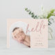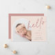 An elegant photo birth announcement design with a unique layout, this chic card features a vertical photo in an arched shape on a soft dusty rose pink background, with "hello" overlaid in hand lettered script typography. Personalise with your new baby's name, birthdate, and birth stats, and add a personal message to the back, along with three additional square photos.