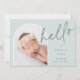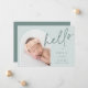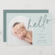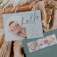 An elegant photo birth announcement design with a unique layout, this chic card features a vertical photo in an arched shape on a soft sage green background, with "hello" overlaid in hand lettered script typography. Personalise with your new baby's name, birthdate, and birth stats, and add a personal message to the back, along with three additional square photos.