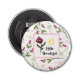 A bottle opener with a square frame and a pink border, inside it says "Hello Beautiful" written in a trendy font with a doodled yellow sun above the text. Also a pretty pink, long stem flower with green leaves off to the side. The backdrop is a seamless pattern with hand drawn pink wildflowers with long green stems and leaves on a eggshell white coloured background. Pink circles and sprigs also decorate the design. Cute and pretty floral design