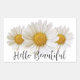 Three white daisies with yellow centres and text "Hello Beautiful" on white background. The text is a template and can be edited.