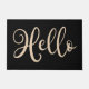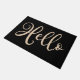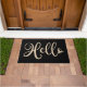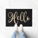 Doormat featuring the text "Hello" in an elegant script font. Neutral light brown text on black background.