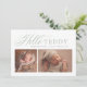 This two-photo birth announcement features an elegant sage green script "hello" beside a name or nickname. It also includes room for the baby's full name and other details along with a square and a horizontal photo. The classic green colour is perfect for announcing a sweet baby boy or girl and the backer is a coordinating stripe. Also available in other colours.