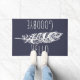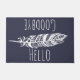 Bohemian cute white tribal feather with the words "hello" and "goodbye". Background colour can be customised.