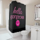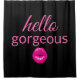 Glam up your decor with this custom "Hello Gorgeous" Shower Curtain. This design features an image of glossy pink lips along with pink font set against a black background.