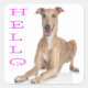 This fun canine sticker features a portrait of a happy tan and white Greyhound puppy dog with a hello greeting printed in a purple heart font highlighted against a crisp white background.