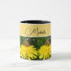 Save the honeybee by letting your Dandelions grow. Photo of a happy honeybee visiting a cheerful bright yellow Dandelion flower in a grassy lawn. With a band of lemon drop yellow to hold your personalised name.