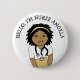 Introduce yourself to your patients with this easy to read name button. Cartoon drawing of a female nurse of colour in teal scrubs.