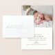 Modern elegant birth announcement featuring the words "hello little one" in a modern script in real foil on the front, optional line underneath (customise or delete field if desired) and birth info along with a photo inside.