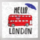 Hello London hand lettering sign with umbrella, red bus and United Kingdom flag in shape of heart on clouds. | © and ® Bigstock® - All Rights Reserved.