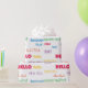A fun pattern that says hello in a variety of colours and languages like French, Spanish and Italian!