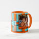 The mug features a vibrant orange and aqua stained glass pattern, offering a unique backdrop for a tow personal photos each with two customizable text spaces. Whether you’re simply saying hello or commemorating a proud moment, this mug provides a visually striking canvas to share your sentiments and keep cherished memories close.