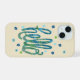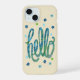 Adorable phone case with the word "hello" with cute flowers. Blue and green funky waves and small flowers on a background of beige with white dots.