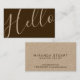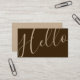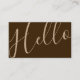 featuring word " hello" in modern calligraphy font style on brown background on front side and details in brown modern sans serif font style on back side.