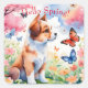 Watercolor painting of an adorable dog surrounded by flowers and butterflies.