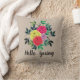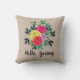 A custom throw pillow that features the text "Hello Spring" along with an image of colourful roses set against a Dhurrie Beige background.