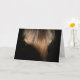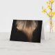 A blank greeting card featuring Thai, a Norwegian Fjord horse, coming from the dark to say hello.
