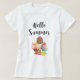 A tee with the text: Hello Summer. illustrated with drawing of a 3 scoop ice cream sundae with colourful sprinkles. An ice cream cone with scoops of chocolate, strawberry and vanilla. A bowl of neopolitan ice cream with a cherry on top. Strawberries and a pineapple fruit sit beside the bowls. A cream and blue chevron pattern along the bottom edge.