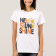 Want to spread the sunshine? Leave a smile on someone's face and make them feel special with this original lettering Hello Sunshine design featuring yellow text in sun shape. Whether you're looking for a fun or cute graphic tee, this t-shirt is perfect for any summer outfit.