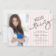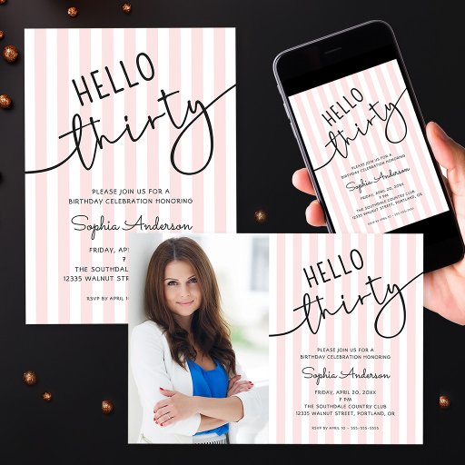 Celebrate turning 30 in style with this chic invitation featuring modern script typography that reads “Hello Thirty.” Set against a soft pink and white striped background, its clean and elegant design makes it a perfect choice for her special day. Personalize with a photo of the birthday girl.