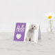 This cute canine note card features a happy white Maltese puppy dog highlighted against a crisp white background with a vibrant purple border highlighting a white hello greeting and a cute white heart. The inside of the card is blank for your message.