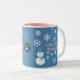 A Slice of Life and Delight presents Hello, Winter Wonderland Two-Tone coffee mugs featuring a snowman decorated with white snowflakes, pink writing, and a blue backdrop. The snowman mugs also feature a blue hat and scarf.