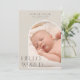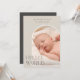 This elegant vertical photo birth announcement features a modern arch shaped photo frame and soft neutral colour palette tones. The phrase, "Hello, World" shares your joy along with classic typography details. The back side features a darker tone colour with space for a horizontal photo and family message.