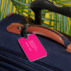 Cool customisable luggage tag with pink background / bold text. You can add your names and address to it.
