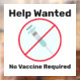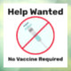 There is a large new pool of people seeking work now who have natural immunity and are unvaccinated. Let this Window sign help you reach out to them and offer them a place to work where they do not need to worry about losing their job because they don't want to take the jab. The sign says: Help Wanted, no vaccine required.