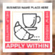 Help Wanted Now Hiring Apply Custom Window Cling is a great ad display or sign for your business when hiring new employees. It is unique and inviting to look at. It will help you spread the word that you are hiring and interviewing. Personalise it with your business name and image for your business or organisation. It will fit many businesses for hiring.