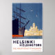 Restored and digitally enhanced reproduction of a travel poster showing two ships in the water near Helsinki's Luthern Cathedral (Tuomiokirkko). Imperfections removed. Colors corrected.